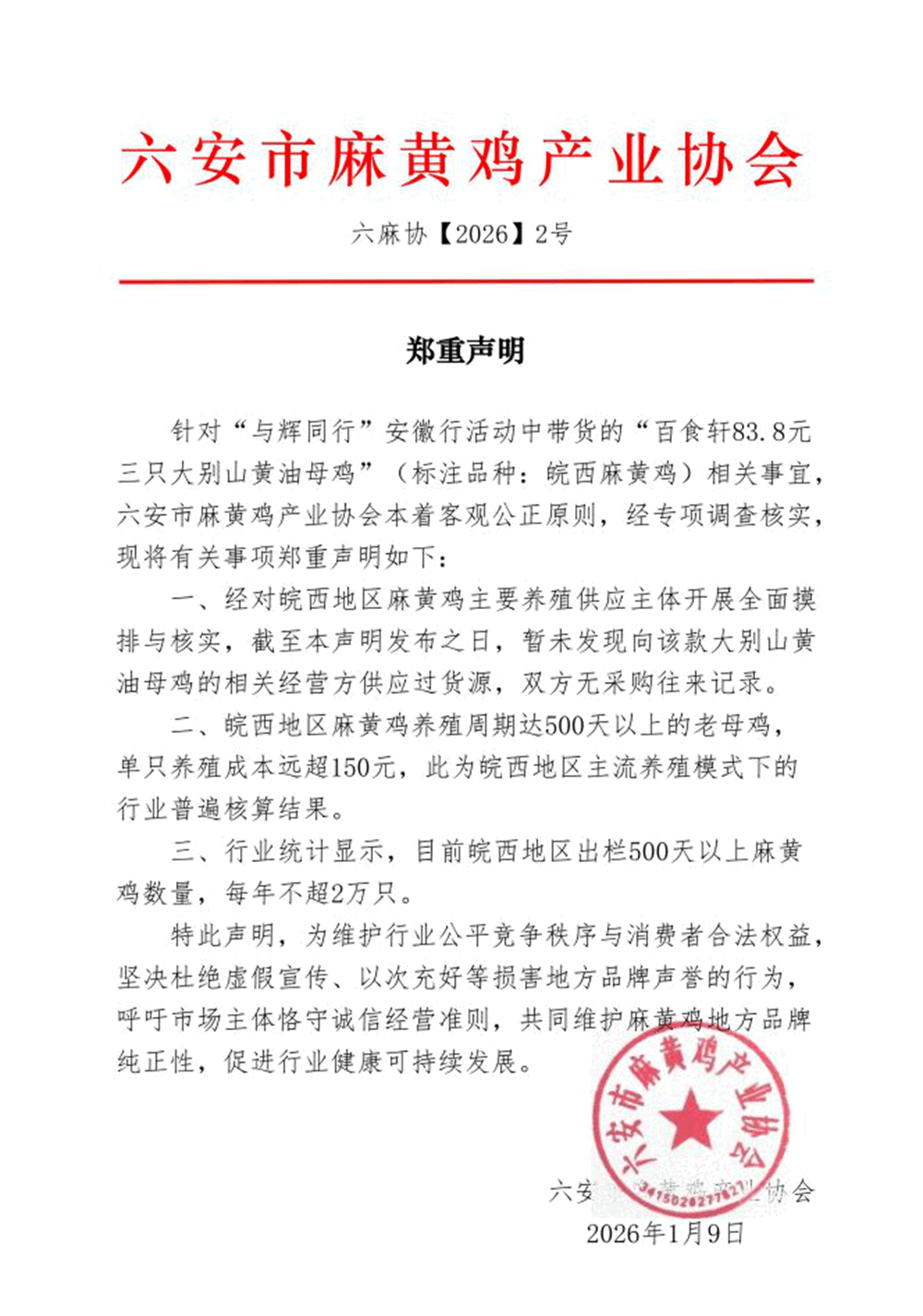 近日,出名曲播间“取辉同业”正在安徽专场中发卖的“大别山黄油母鸡”激发行业质疑。据中国食物平安网报道,六安市麻黄鸡财产协会发布声明,指出该产物存正在虚构品种、外不雅不符、货源不明等多沉问题,
